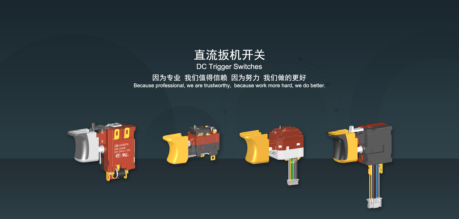 浙江佳奔電子有限公司始建于1986年,坐落于浙江省樂清市虹橋鎮(zhèn)東電子信息產(chǎn)業(yè)園內(nèi),現(xiàn)有職工700多人,資產(chǎn)總額超3億元。公司主要經(jīng)營“JIABEN”牌微動開關(guān)、蹺板開關(guān)、按鈕開關(guān)、扳機(jī)開關(guān)、調(diào)速開關(guān)和電位器開關(guān)等各類交、直流器具開關(guān)和各類交、直流線路板模塊等產(chǎn)品,主要應(yīng)用于交、直流電動工具、電動園林工具、清潔器具、家用電器和小型機(jī)床等行業(yè),是集產(chǎn)品設(shè)計(jì)、研發(fā)、制造、銷售和服務(wù)于一體的國家高新技術(shù)企業(yè)。JIABEN was founded in 1986, located in East Electronic Information Industry Park, Hongqiao Town, Yueqing City, Zhejiang Proviance, existing staff more than 700 peoples, more than 300 million RMB worth of assets. Company is mainly engaged in "JIABEN" brand Micro Switch, Rocker Switch, Push-button Switch, Trigger Switch, Speed Regulating Switch, Potentiometer Switch and other kinds of appliance switch and all kinds of AC or DC circuit board module, such as more than 100 series, 8000 kinds of models of products, mainly used in AC or DC Power-tools, Power Gardening Tools, Cleaning Appliances, Household Appliances and Small Machine Tool and other industries, is the collection product design, research and development, manufacturing, sales and service in one of the national high and new technology enterprise.
